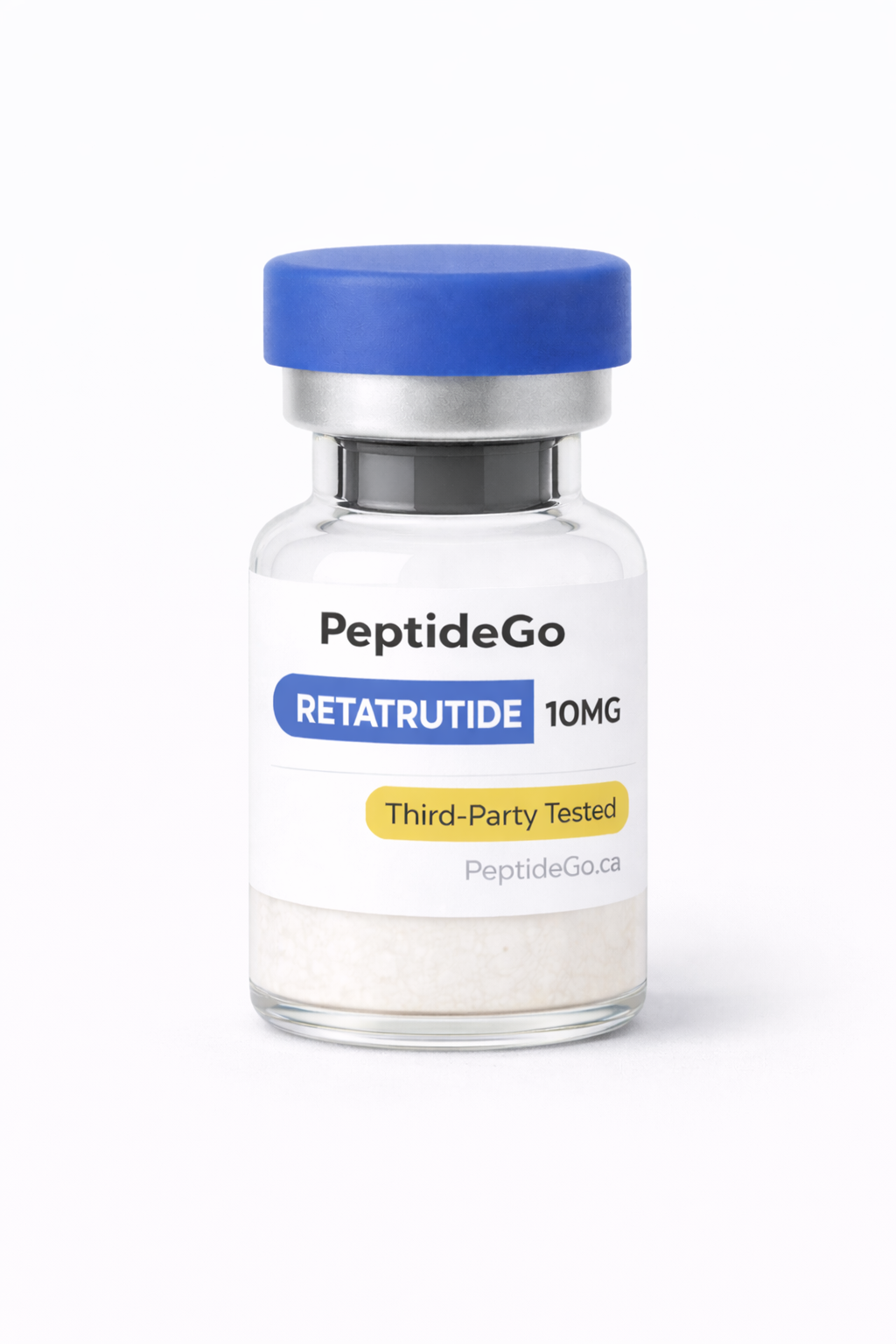 PeptideGo Retatrutide 5mg vial with blue cap, third-party tested research peptide, lyophilized powder, shipped from Hamilton Ontario.
